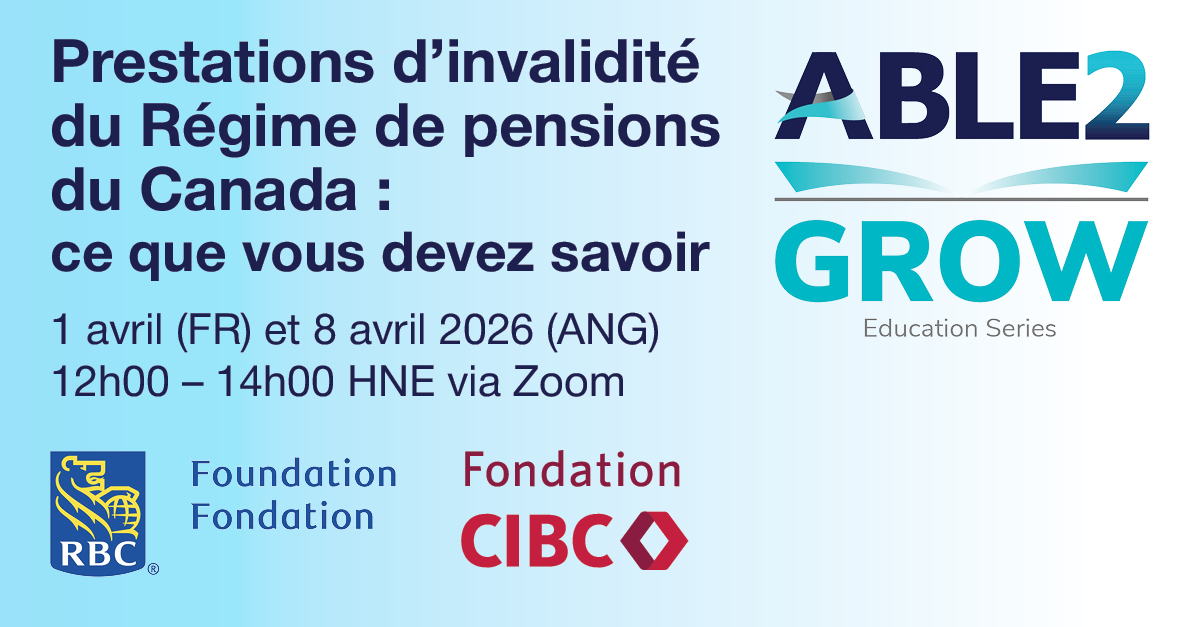 Participez au webinaire d’introduction d’ABLE2 sur la prestation d’invalidité du Régime de pensions du Canada (RPC), dans le cadre de notre série GROW sur la littératie financière. Cette séance vous fournira des renseignements essentiels sur la prestation d’invalidité du RPC : sa nature, les personnes qui en bénéficient, les prestations qu’elle offre et la procédure de demande.