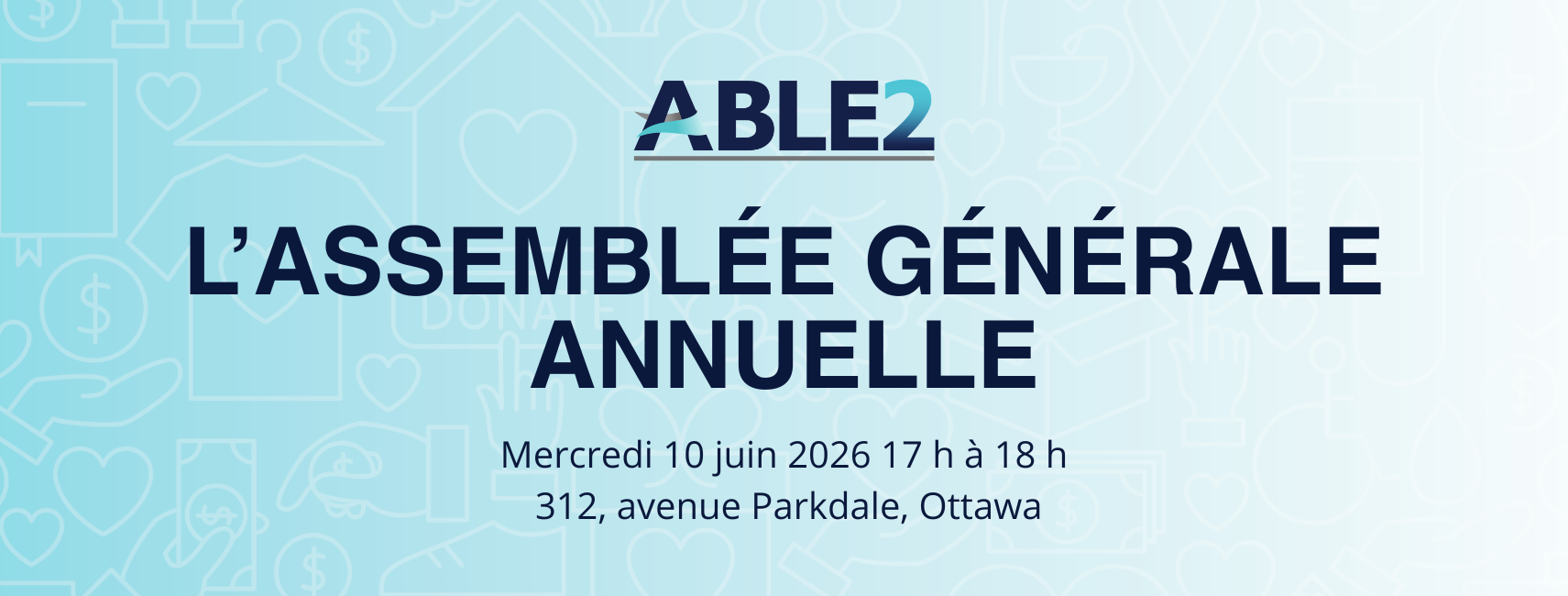 L’Assemblée Générale Annuelle (AGA) d’ABLE2 aura lieu le mercredi 11 juin à 17h00 au 312 avenue Parkdale, Ottawa, ON K1Y 4X5.